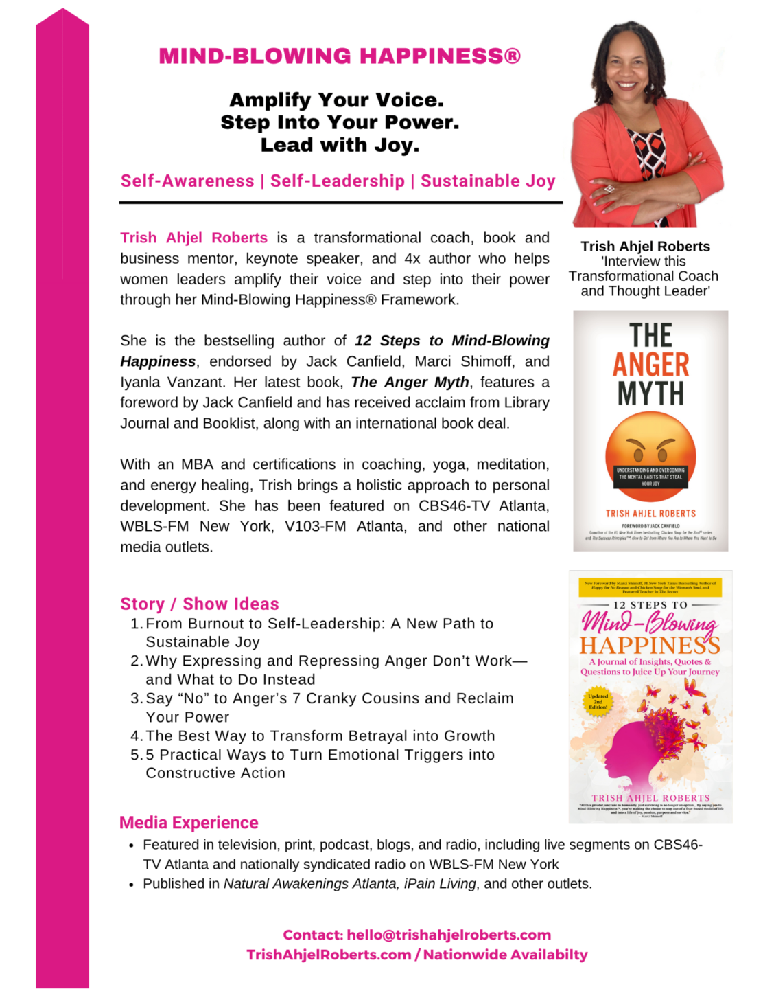 She is the bestselling author of 12 Steps to Mind-Blowing Happiness, endorsed by Jack Canfield, Marci Shimoff, and Iyanla Vanzant. Her latest book, The Anger Myth, features a foreword by Jack Canfield and has received acclaim from Library Journal and Booklist, along with an international book deal.